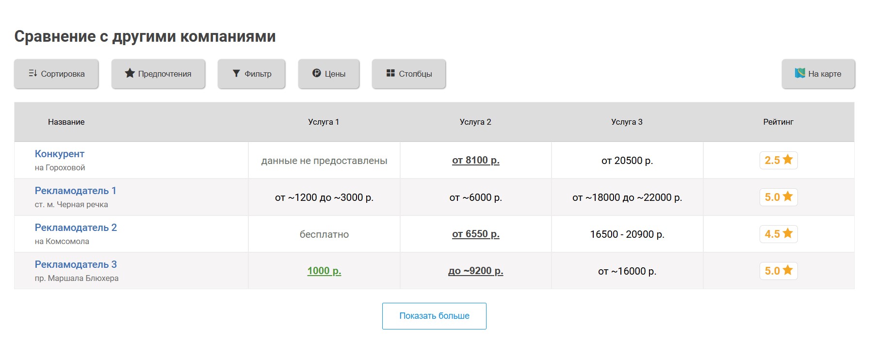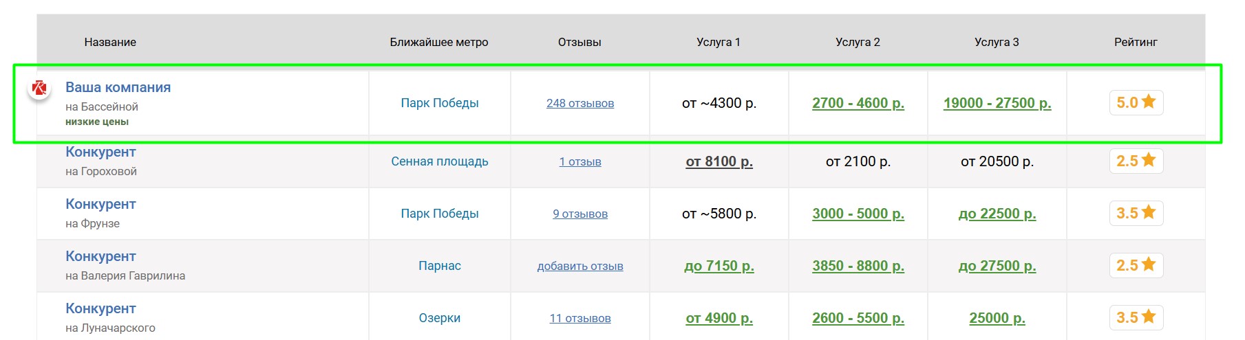 Вокруг продвигаемой таким образом автошколы выбирается некоторое количество ближайших конкурирующих автошкол, продвигаемая автошкола попадёт к ним в таблицу «Сравнение по ценам», которая выглядит следующим образом: